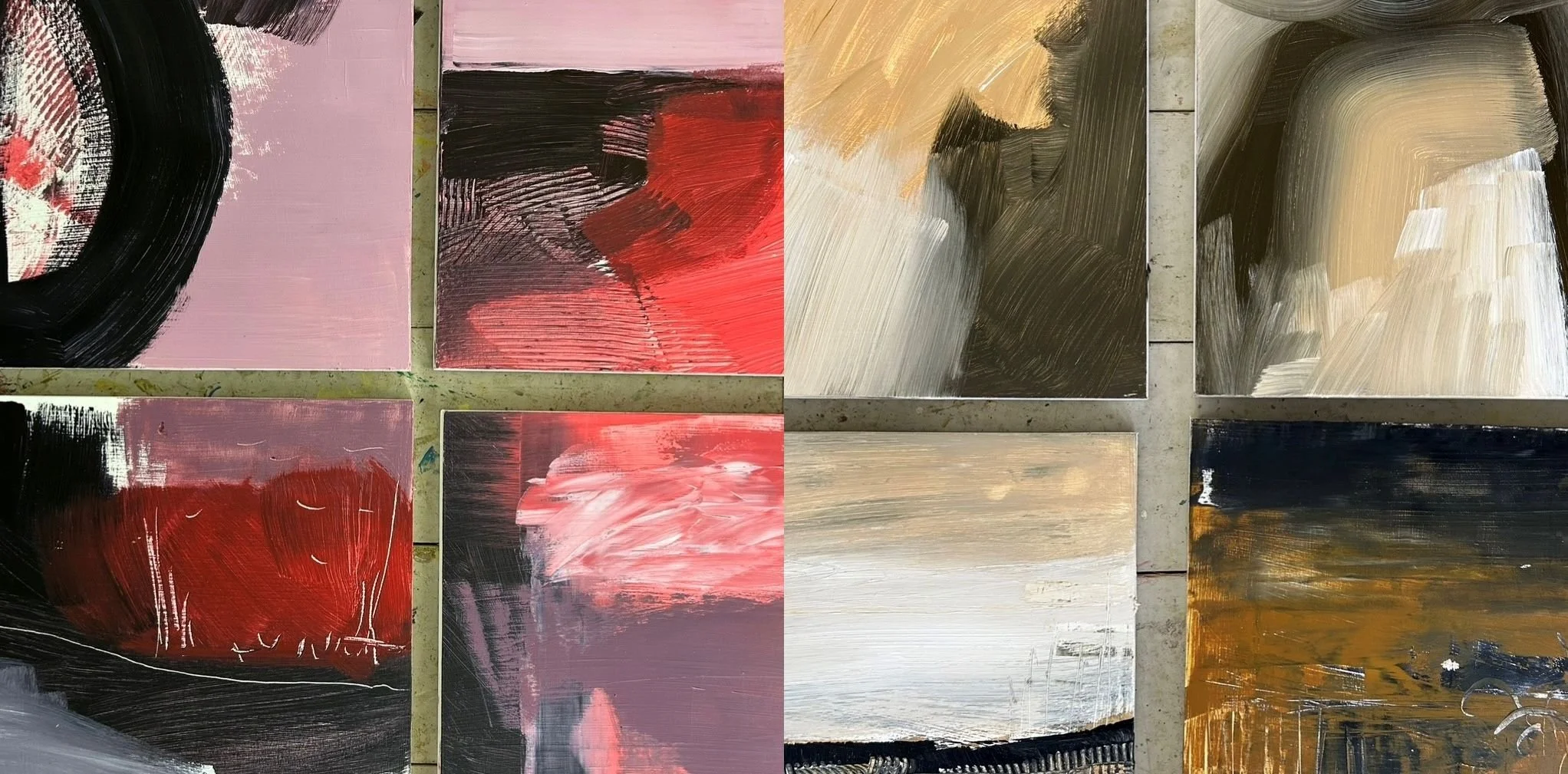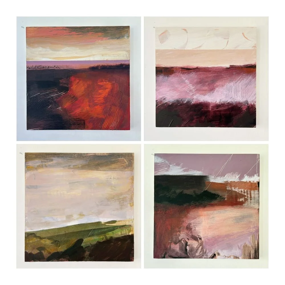 I had such a good time making this series of paintings. I bought 12 cradled wooden panels – 25 x 25cm and worked with a limited palette. For the first 4 I used cadmium red, white and paynes grey – wasn’t very keen. For the next 4 I used yellow ochre, white and paynes grey – better. For the next 4 I used all of them together and found the sweet spot.